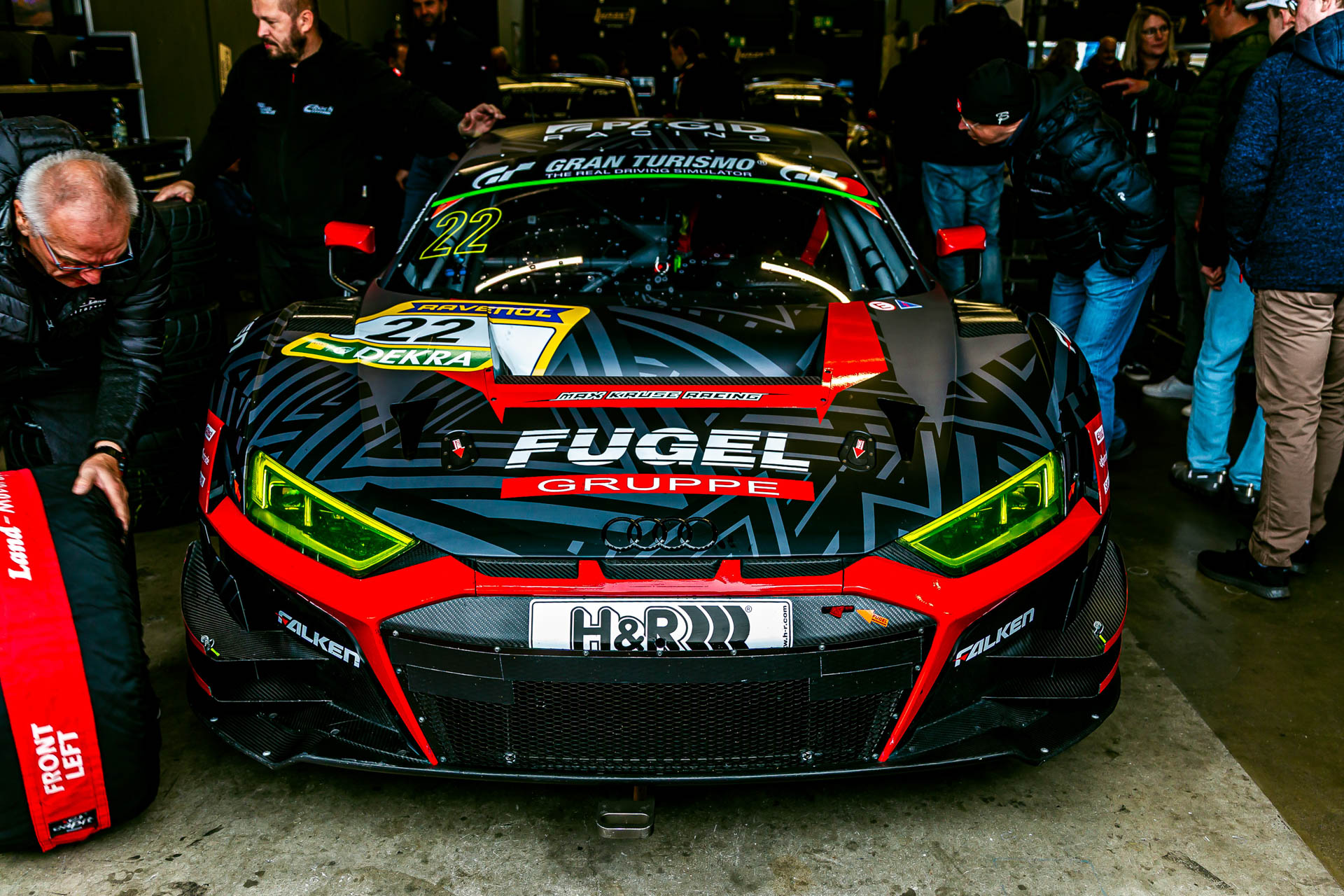 In seinem Doppelstint fuhr Verstappen im Ferrari trotz eines sehr konservativen Boxenstopp der schweizer Emil Frey Mannschaft teilweise über eine Minute Abstand auf die Nachfolger raus. Eine wirklich bemerkenswerte Leistung wie auch später Frank Stippler im Interview zum besten gab – Stippi selbst habe vom Holländer im Grunde nichts anderes erwartet. Das Stippler am Ende noch mit auf dem Podest stand war einer grandiosen letztebn halben Stunde im Rennen Vincent Kolb zu verdanken, Kolb widerstand im HRT Ford Mustang GT3 allen Angriffversuchen des von hinten drückenden Max Kruse Rasing, Fugel gebrandeten, AUDI R8 #22 der mit Position 4 gesamt zwar das Podium verpasste aber seine Klasse für mit regenerativen Kraftstoffen betankte Fahrzeuge deutlich gewann. Glückwunsch an Benny Leuchter, Macel und Dominik Fugel. (Ein grandioses Design des AUDI’s von berzerkdesign) Ein durch und durch unauffälliges aber um so erfolgreicheres Rennen fuhren Scherer, Fetzer und Mardenborough, die Ihren Ford Mustang GT3 #9 auf P2 hinter Verstappen und Lulham mit knappen 25 Sekunden über die Ziellinie brachten.
